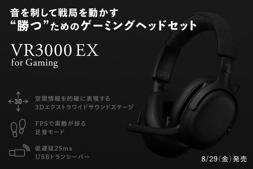 「VR3000 EX for Gaming」はfinalが手掛ける最新ゲーミングヘッドセット。3Dエクストラワイドサウンドステージ、足音モード、25ms低遅延ドングル搭載でFPSやeスポーツに最適。Amazon先行発売でお得に購入可能。