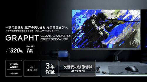 QD-Mini LED搭載の27インチゲーミングモニター「GRAPHT GR2732DML-BK」登場。残像低減技術MPCS TECHと320HzリフレッシュレートでFPS・eスポーツに最適。HDR1000対応・1ms応答・WQHD解像度のハイスペックモデル。スタンドレス&スタンド付属の2タイプ展開でデ…
