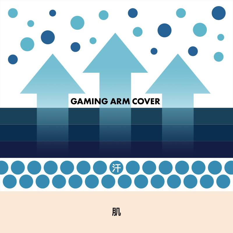 このアームカバーの最大の特徴は、肘から前腕にかけて内蔵されている「フレキシブルパッド」と呼ばれる薄型の衝撃吸収材です。このパッドは、腕を適度にサポートし、長時間の使用でも疲れにくい設計です。さらに、縦横の摩擦係数が低いポリエステル生地を採用しているため、マウス操作時のスムーズさも保証されます。